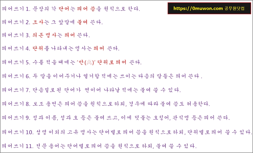 띄어쓰기 규정입니다. 기본원칙을 포함 11개 항이 있습니다. 아래 이미지를 저장해 놓고 계속 보시기를 추천합니다. 중요한 몇가지만 자세히 알아보도록 하겠습니다.