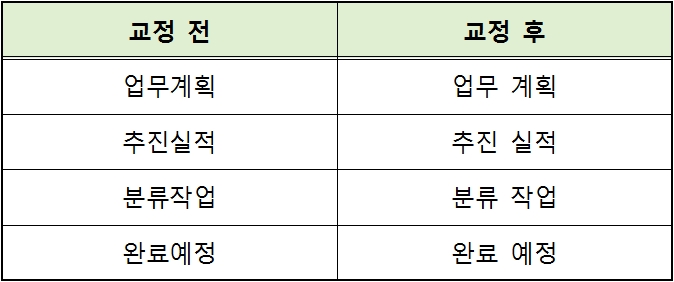 완료예정은 완료∨예정, 업무계획은 업무∨계획, 추진실적은 추진∨실적으로 띄어쓰기 합니다.