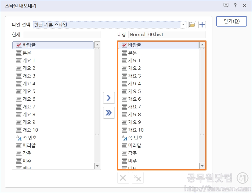 서식 > 스타일 > 스타일 내보내기 > 파일 선택 > Normal(한글기본 스타일) > 바탕글 제외하고 모두 삭제 > 닫기 > 저장으로 스타일을 정리합니다. 한글 2010, 2018 등 버전에 따라 조금 차이는 있을 수 있습니다만, 방법은 동일합니다.