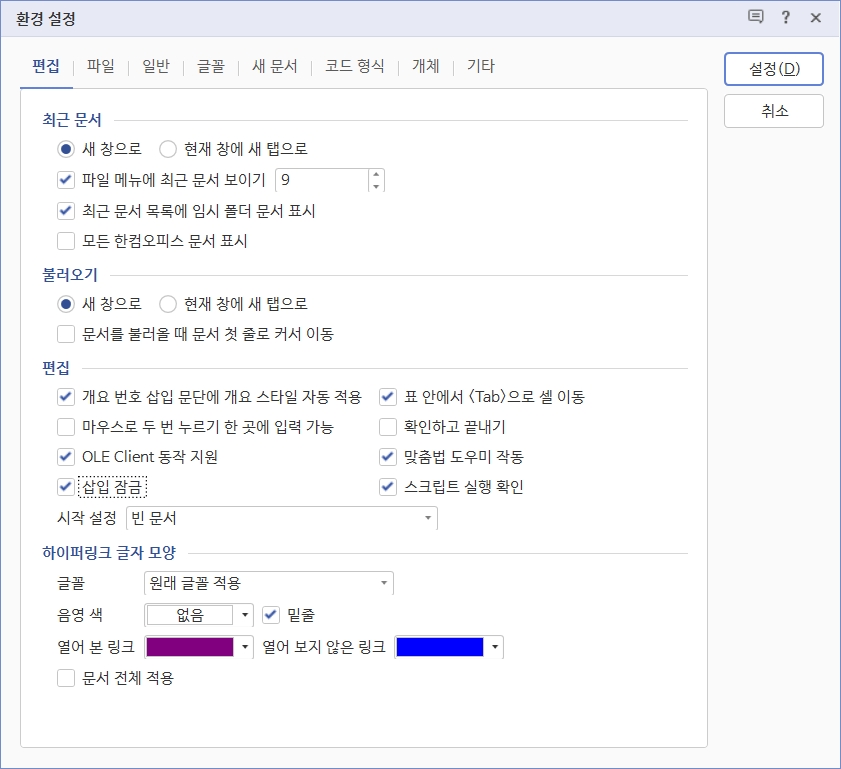 그리고 문서를 작성하다 보면 가끔 '수정' 상태로 변경이 되어 글자를 입력하면 삭제가 되면서 수정이 되는 경우가 생깁니다. 이 것을 방지하기 위하여 '삽입 잠금'을 체크합니다. 그러면 항상 삽입으로만 글자를 입력할 수 있습니다. 한글 2010 버전에서는 기타 탭에서 설정이 가능합니다.