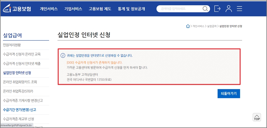 인터넷 신청 대상자가 아닌 경우 신청할 수 없습니다. 수급자격 신청서가 존재하지 않습니다. 가까운 고용센터에 방문하여 수급자격 신청을 먼저 하여야 합니다. 수급자격 신청은 인터넷으로는 할 수 없습니다.