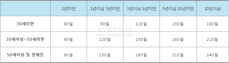 퇴직당시 나이가 50세이상 또는 장애인인 경우는 1년 미만은 90일, 1년 이상 3년 미만은 150일, 3년 이상 5년 미만은 180일, 5년 이상 10면 미만은 210일, 10년 이상이면 240일동안 실업급여를 받게 됩니다.