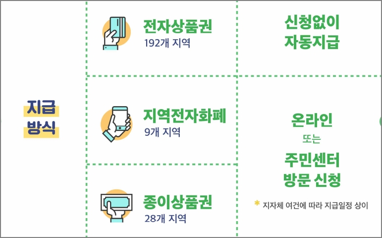 지역 전자화폐로 지급하는 지역은 신청을 하여야 합니다. 각 지역에서 사용하고 있는 전자 화폐방식에 따라 신청방법과 지급시기가 다르므로 해당 시군구의 안내에 따라 신청하면 됩니다. 4월 초부터 온라인 또는 방문신청 후 지역 전자화폐를 통해 쿠폰을 받을 수 있습니다.
