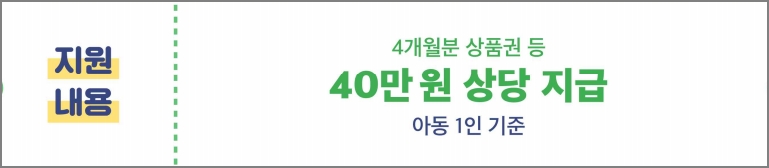 아동돌봄쿠폰은 아동 1인당 40만원 상당의 상품권 등으로 지원이 됩니다. 지원대상 아동이 2명이면 80만원 상당을 받을 수 있습니다.
