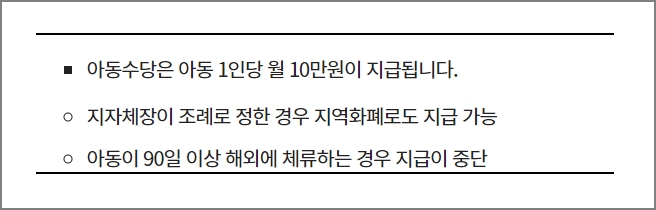 아동수당은 만 8세 미만 아동이 받을 수 있습니다. 95개월까지 해당이 됩니다. 생일이 지나 만 8세 이상이 되면 지급이 되지 않습니다. 아동 1인당 매월 10만원이 지급이 됩니다. 경기도 등 일부 지자체는 지역화폐로 지급을 하고 있습니다. 아동이 90일 이상 해외에 체류하는 경우에는 지급이 중단됩니다.