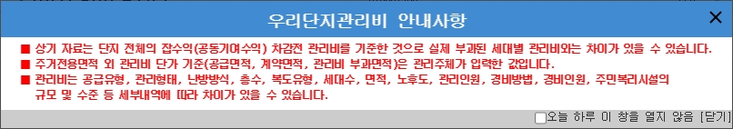 ▼ 검색해서 나오는 관리비는 단지 전체의 잡수익 차감전 관리비를 기준한 것으로 실제 부과된 세대별 관리비와는 차이가 있을 수 있습니다. 주거전용면적 외 관리비 단가기준은 단지 관리주체가 입력한 값입니다. 이런 점은 참고해서 보시면 됩니다.