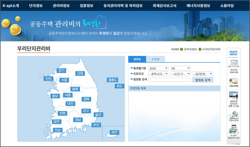공동주택관리정보시스템에서는 아파트의 관리비 정보를 공개하고 있습니다. 공동주택관리정보시스템이란? 공동주택 관리비의 투명성을 위해서 아파트의 관리비, 유지관리이력, 입찰정보 등 공동주택관리정보를 공개하고 운영하는 시스템입니다. 네이버, 다음 등 검색엔진에서 공동주택관리정보스템을 검색합니다. <▼k-apt.go.kr 바로가기>