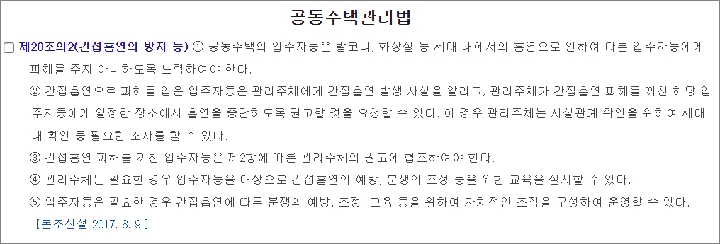 관련 법부터 알아보도록 하겠습니다. 공동주택관리법을 보면 발코니, 화장실 등 세대 내에서의 흡연으로 인하여 다른 사람들에게 피해를 주지 않도록 노력하여야 한다고 되어 있습니다.