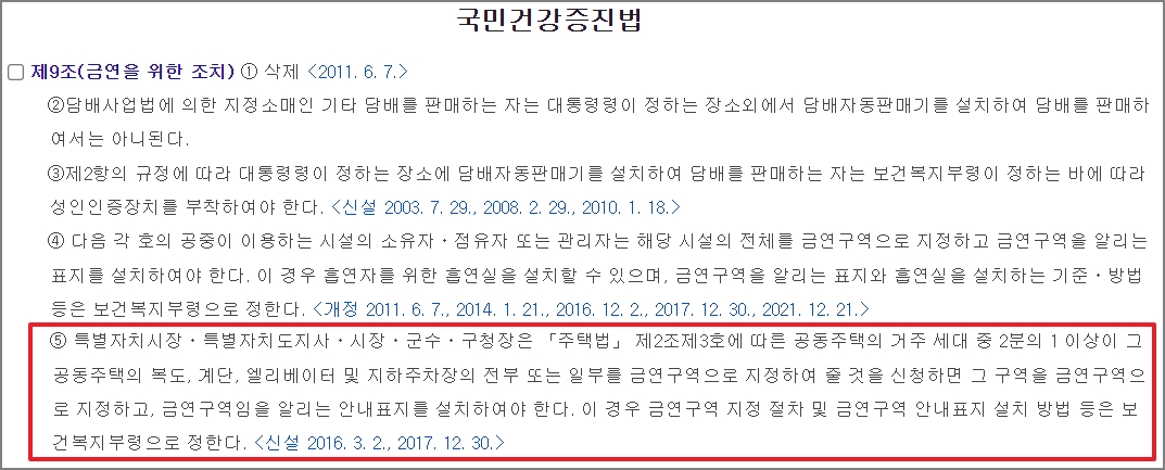금연 구역으로 지정할 수 있는 건, 복도, 계단, 엘리베이터, 지하주차장 같은 공용 공간만이고 세대 내는 해당이 안됩니다. 금연구역으로 지정된 곳에서 담배를 피는 경우에만 과태료가 부과가 됩니다.