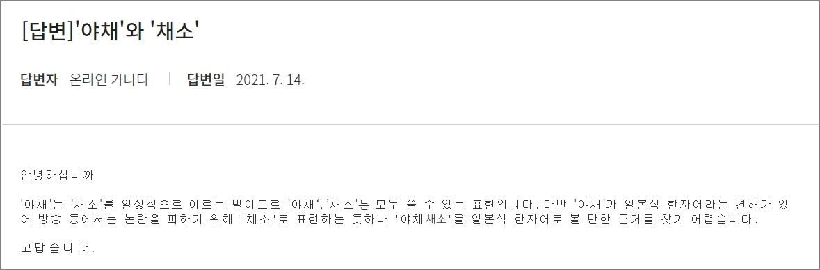 그러니 앞으로는 야채인지 채소인지 고민하지 않으셔도 됩니다. 같은 의미입니다. 채소라고 해도 맞고 야채라고 해도 맞습니다.