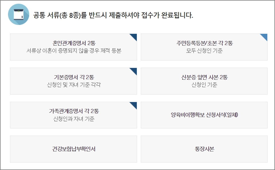 - 제출서류 : 주민등본에 등록되어 있는 성인세대원의 건강보험 납부확인서(최근1년치) 또는 한부모, 차상위, 국민기초생활수급 증명서 중 택1