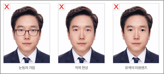 머리카락, 안경테 등으로 눈을 가린 사진과 적목현상이 있는 사진은 사용할 수 없습니다. 유색의 미용렌즈, 렌즈에 색이 들어간 안경 그리고 선글라스는 사용할 수 없습니다.