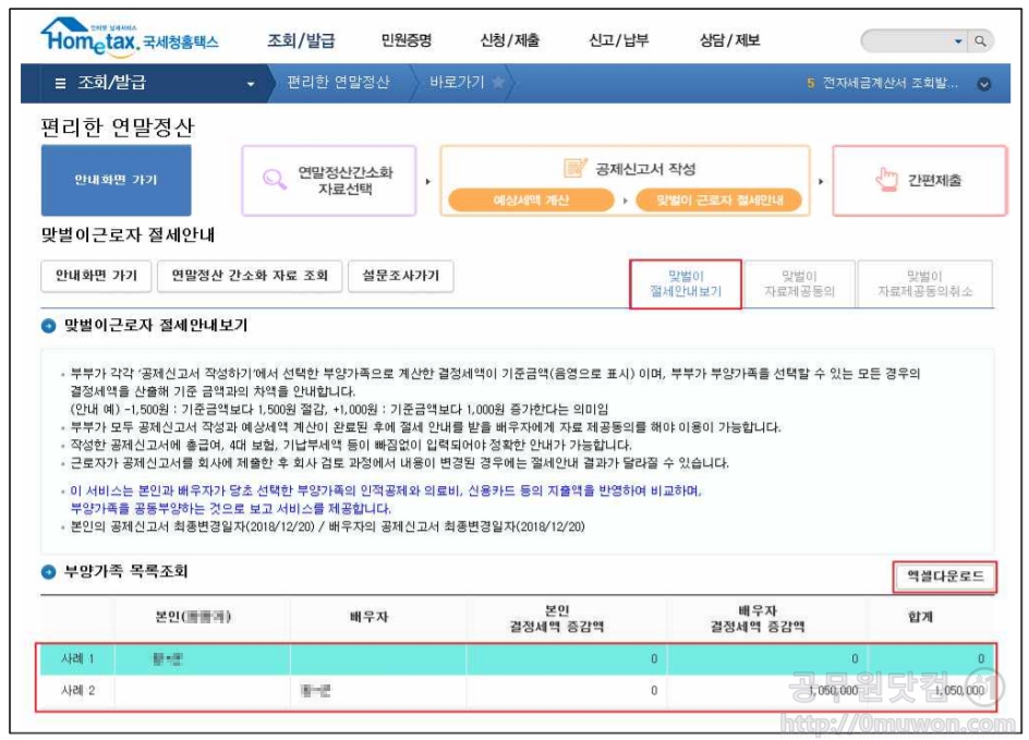 6. 부양가족을 부부가 각각 공제받는 경우의 수를 볼 수 있습니다. ‘계산하기’를 누르면 사례별로 결정세액의 증감액과 합계를 확인할 수 있습니다.