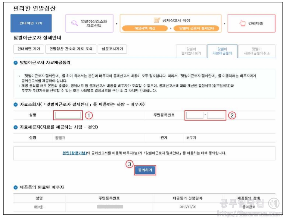 맞벌이근로자 절세 안내 서비스를 이용하기 위해서는 배우자로 부터 배우자의 공제신고서 제공 동의를 받아야 합니다.본인이 배우자에게 공제신고서 자료제공 동의를 해야만 배우자가 맞벌이 근로자 절세 안내 서비스를 이용할 수 있습니다. 자료제동 동의 취소 방법은 글 하단에서 확인해보세요.