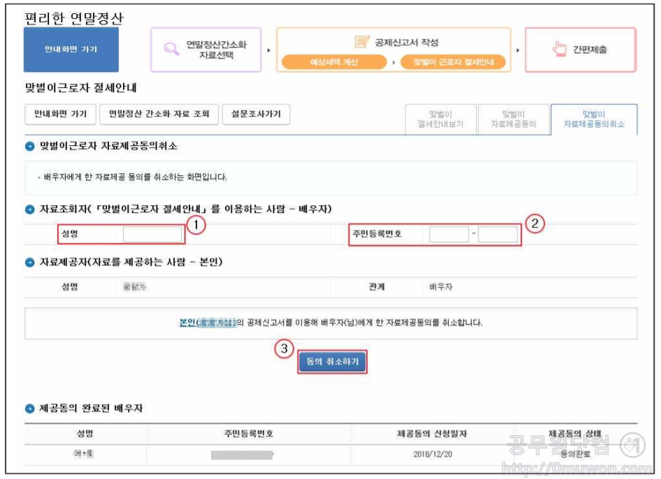 본인의 공제자료를 조회할 수 없도록 자료조회자(배우자)의 성명, 주민등록번호을 입력 합니다. 입력이 완료되면 “본인(◌◌◌님)의 공제신고서를 이용해 배우자 (△△△님)에게 한 자료제공동의를 취소합니다”라는 안내문구가 표시됩니다. ‘동의 취소하기’를 클릭하면 신청이 완료되며, 상대방이 더 이상 자신의 자료를 조회 할 수 없게 됩니다.