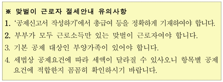 바로 아래의 맞벌이 근로자 절세 안내 유의사항부터 확인해보시기 바랍니다. ▼ 연말정산 기간, 일정 완벽정리 (준비부터 환급 및 추가신고까지)