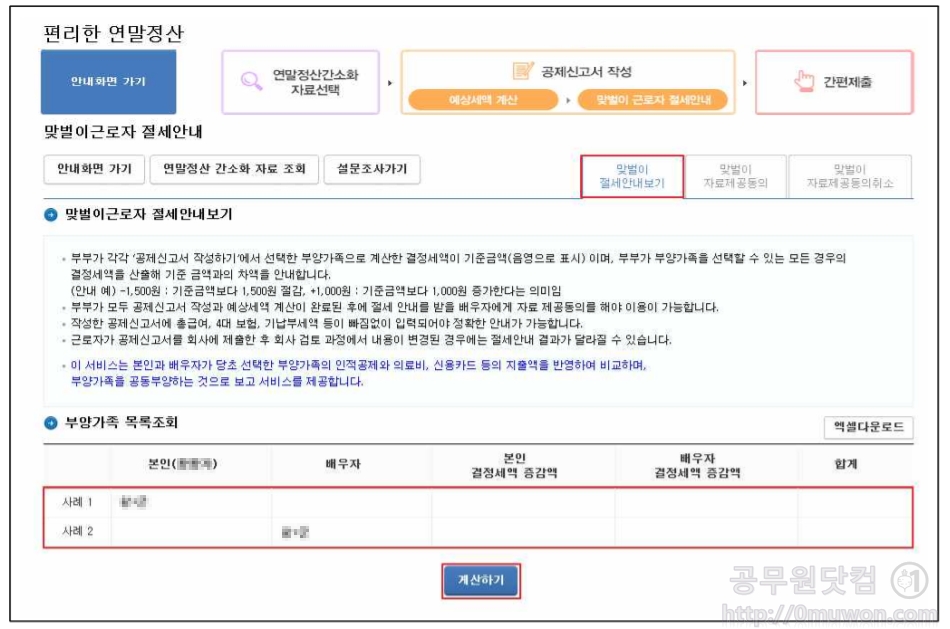 6. 부양가족을 부부가 각각 공제받는 경우의 수를 볼 수 있습니다. ‘계산하기’를 누르면 사례별로 결정세액의 증감액과 합계를 확인할 수 있습니다.