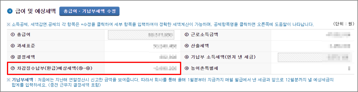 ▼ 급여 및 예상세액이 나옵니다. 여기에서 중요한게 바로 7번 항목입니다. 차감징수납부(환급) 예상세액을 확인해보세요. 마이너스(-)로 나오면 돈을 돌려받을 수 있다는 뜻입니다. 계산 값이 플러스(+)라면 그만큼 세금을 더 납부해야 한다는 뜻입니다.