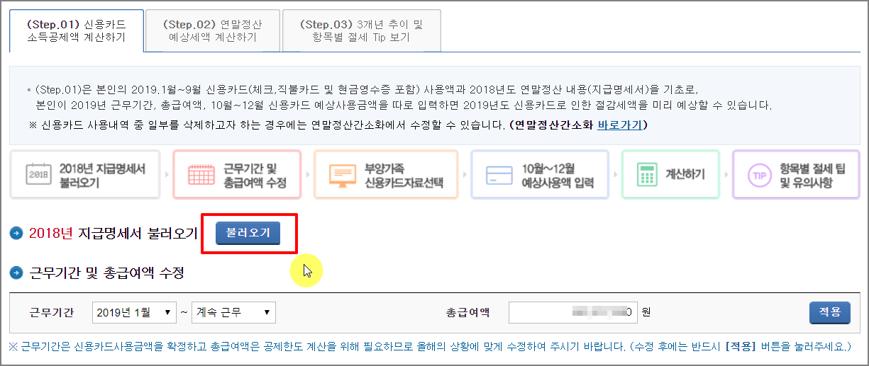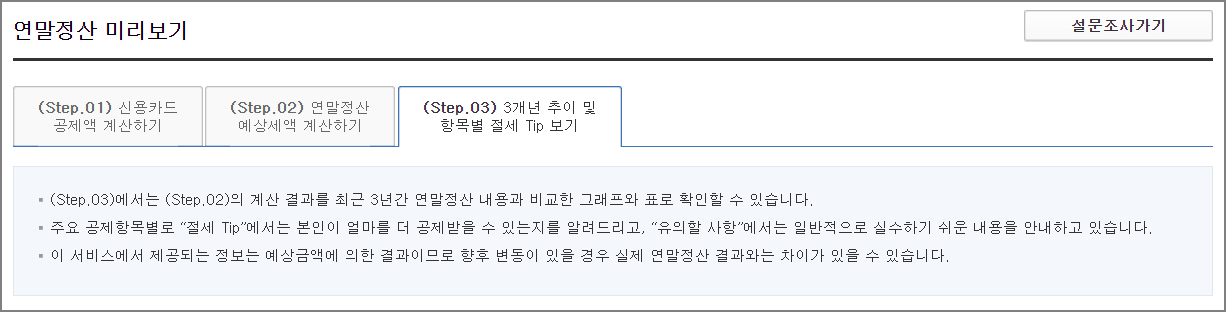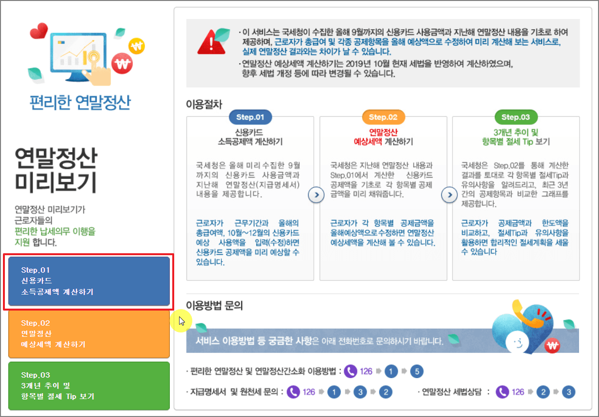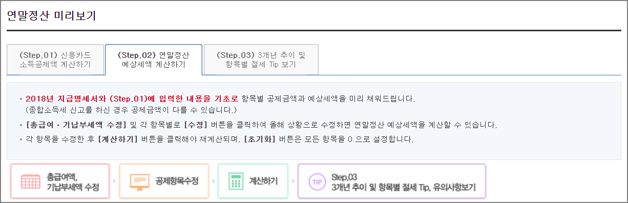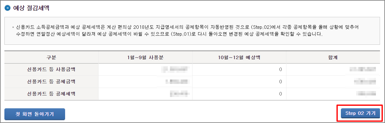 ▼ 왼쪽메뉴 "Step. 01 신용카드 소득공제액 계산하기" 버튼을 클릭합니다.