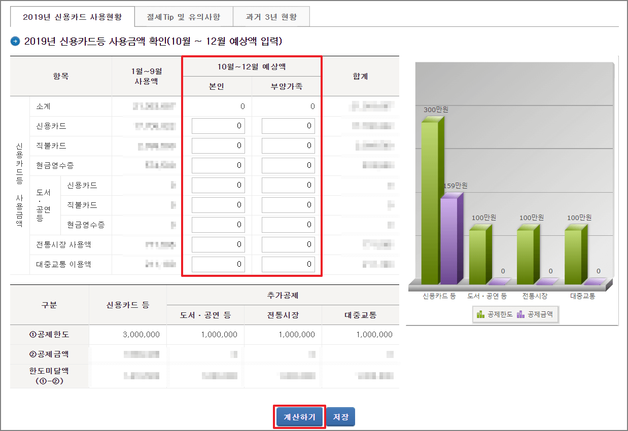 예상액이 정확할 수록 예상세액도 정확합니다. 예상금액을 잘모르는 경우 1월부터 9월까지 사용액을 3으로 나눈 금액을 평균으로 입력하셔도 됩니다. 참고로 신용카드 등 공제한도는 3,000,000원이며, 추가공제로 도서공연, 전통시장, 대중교통 이용료가 각각 1,000,000원 입니다.