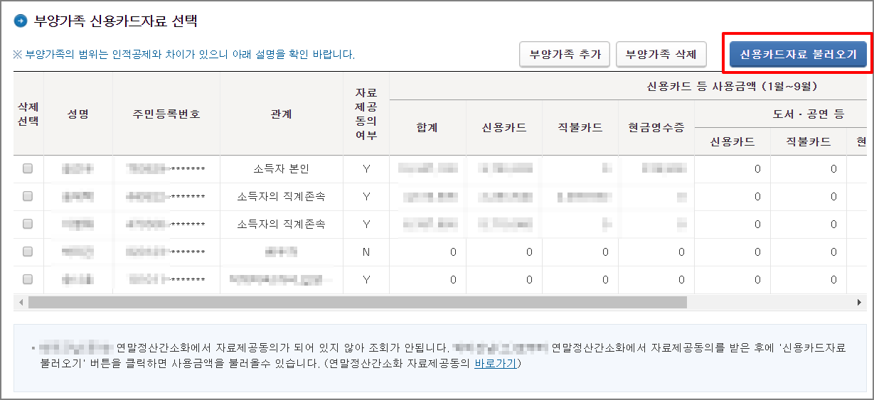 ▼ 부양가족을 추가하거나, 삭제를 하세요. 변경이 없다면 그대로 이용하시면 됩니다. 신용카드 자료불러오기를 클릭하면 1월부터 9월가지 신용카드 사용내역이 자동으로 입력됩니다. 클릭하지 않으면 입력되지 않습니다. 연말정산간소화에서 자료제공동의가 되어 있지 않은 경우에는 사용금을액 불러올 수 없습니다.