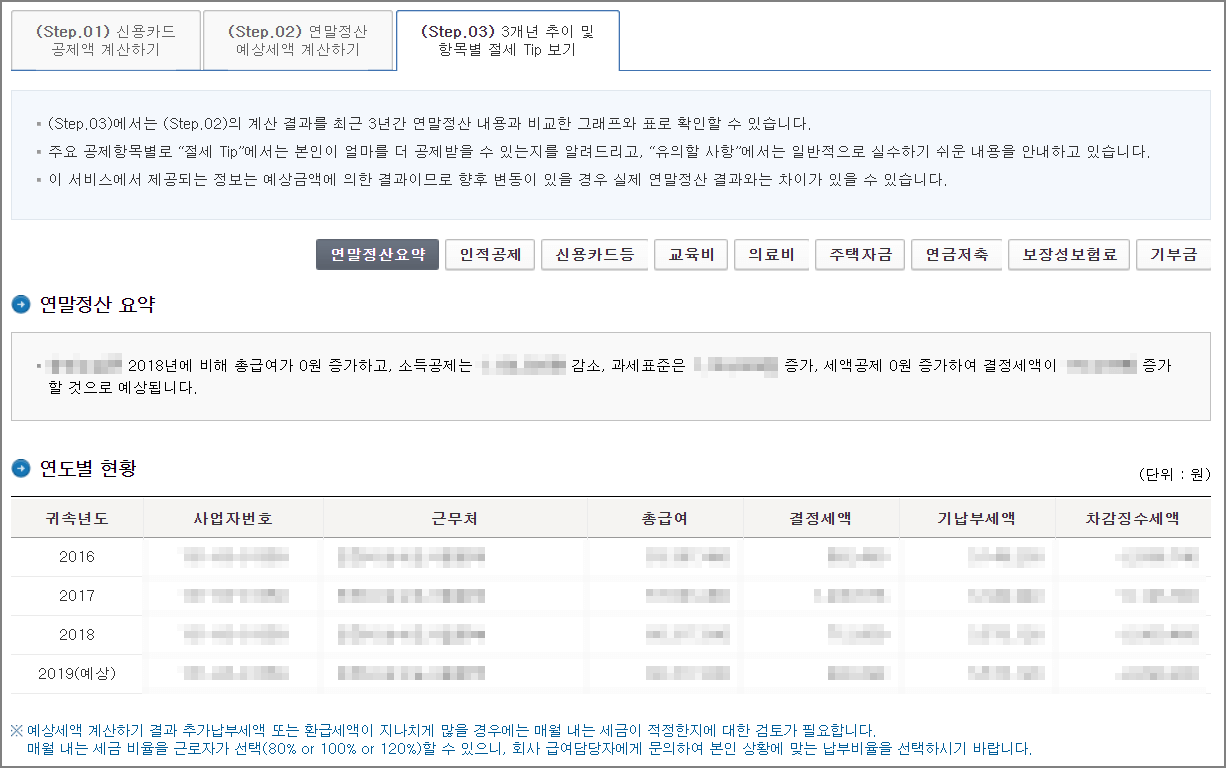 ▼ 스탭3은 연말정산 요약결과입니다. 3개년 동안의 총급여, 소득공제, 과세표준, 세액공제, 결정세액 등을 전년도와 비교하여 나옵니다. 총급여는 늘지 않았습니다. 매월 내는 세금 비율을 근로자가 선택(80% 또는 100% 또는 120%) 할수 있습니다. 변경이 필요한 분은 회사 급여담당자에게 이야기하여 상황에 맞게 변경하기 바랍니다.