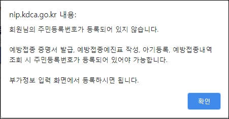 3. 예방접종증명서를 발급 받으려면 주민등록번호가 등록이 되어 있어야 합니다. 예방접종예진표 작성, 아기 등록도 가능합니다. 확인 버튼을 클리갛여 부가정보를 입력합니다.