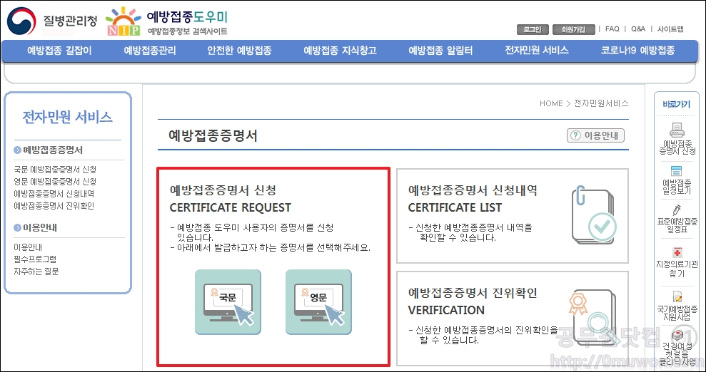 2. 예방접종증명서 신청을 합니다. 국문과 영문으로 신청이 가능합니다. 원하는 증명서를 선택합니다.
