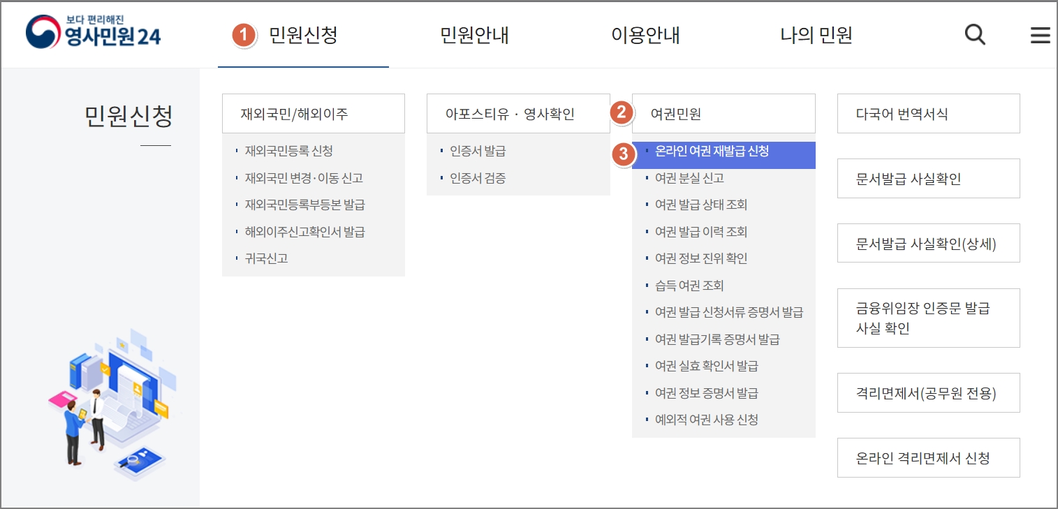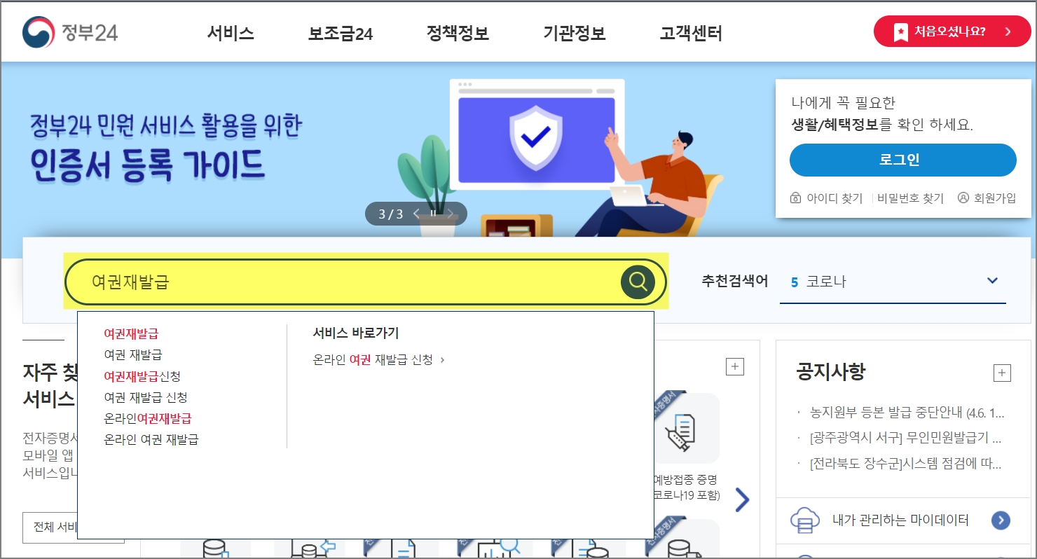 예전에는 시청 등을 방문해야 재발급이 가능했지만, 지금은 온라인으로도 여권이 재발급이 됩니다.
