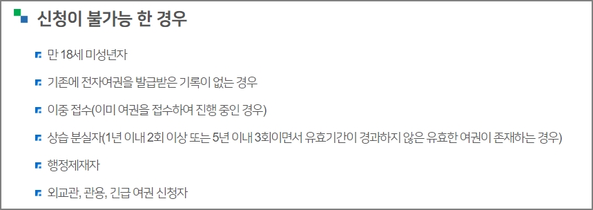 만 18세 미만의 미성년자나 기존에 전자여권을 발급 받은 기록이 없는 경우, 상습 분실자, 신규로 여권을 발급하는 경우, 영문 이름을 변경하는 경우에는 온라인 신청이 안됩니다. 시청 등에 방문해 신청을 해야 합니다.