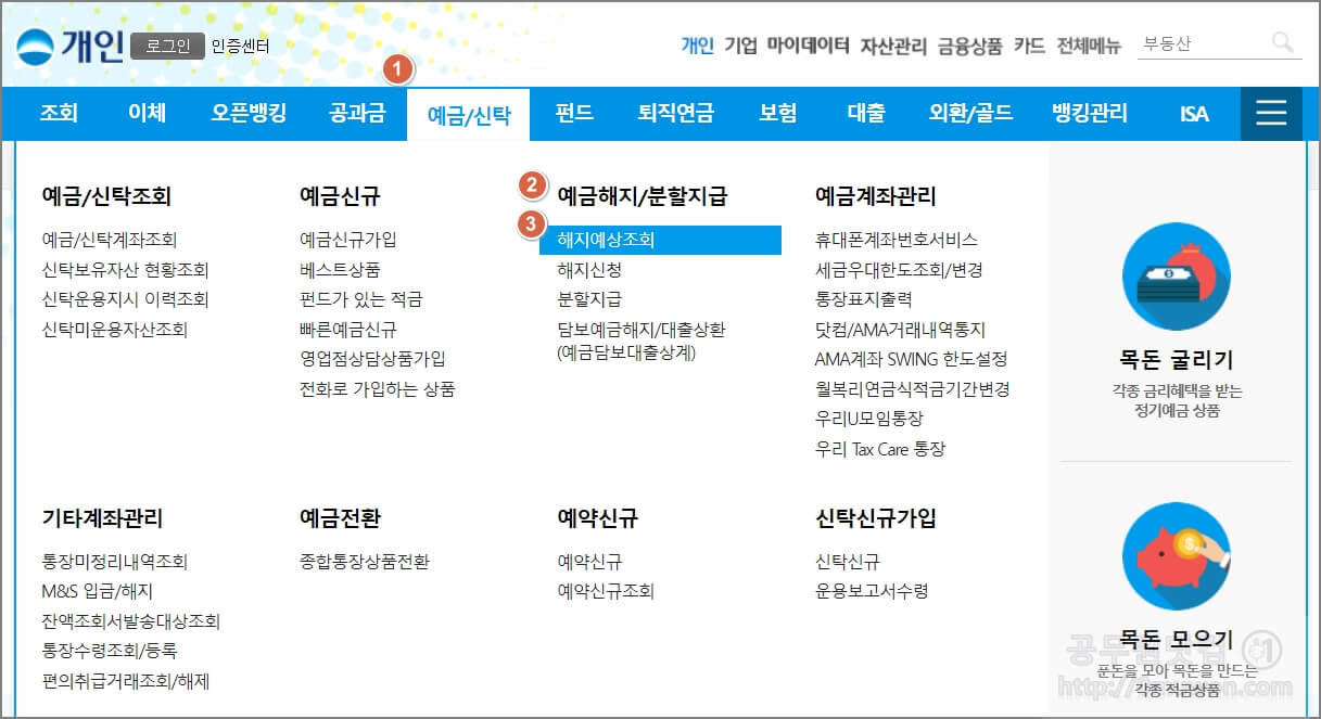 1. "예금/신탁 > 예금해지/분할지급 > 해지예상조회 또는 해지신청"을 클릭합니다.