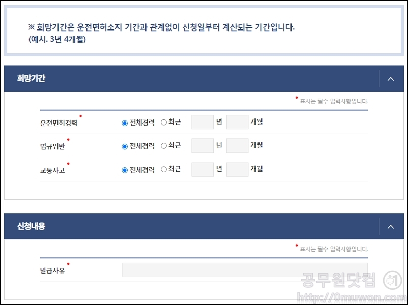 6. 운전경력증명이 필요한 기간을 입력합니다. 희망기간은 운전면허소지 기관과 관계없이 신청일 부터 계산이 됩니다. 운전면허경력, 법규위반, 교통사고 확인이 필요한 기간을 입력합니다. 전체경력이 필요한 경우는 전체경력을 체크하시면 됩니다. 그리고 발급 사유도 간단하게 입력합니다. 취업용, 운전경력확인용 등 발급사유를 적으면 됩니다.