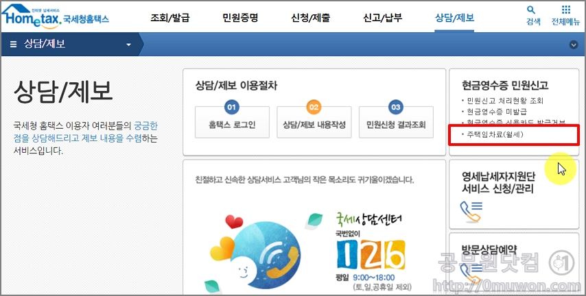 ▼ 현금영수증 민원신고에서 "주택임차료(월세)"를 클릭합니다.