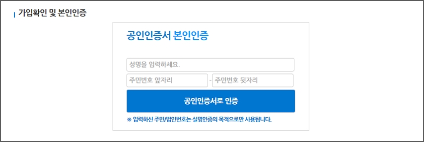 ▼ 공인인증서 또는 디지털원패스 인증하기. 공인인증서 본인인증 또는 디지털원패스(14세 이상 개인만) 인증 절차를 거쳐야 회원가입 다음단계를 진행 할수 있습니다.