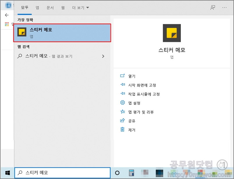 윈도우 검색창에서 "스티커 메모"를 입력 후 상단에 나나타는 "스티커 메모" 앱을 클릭을 합니다.
