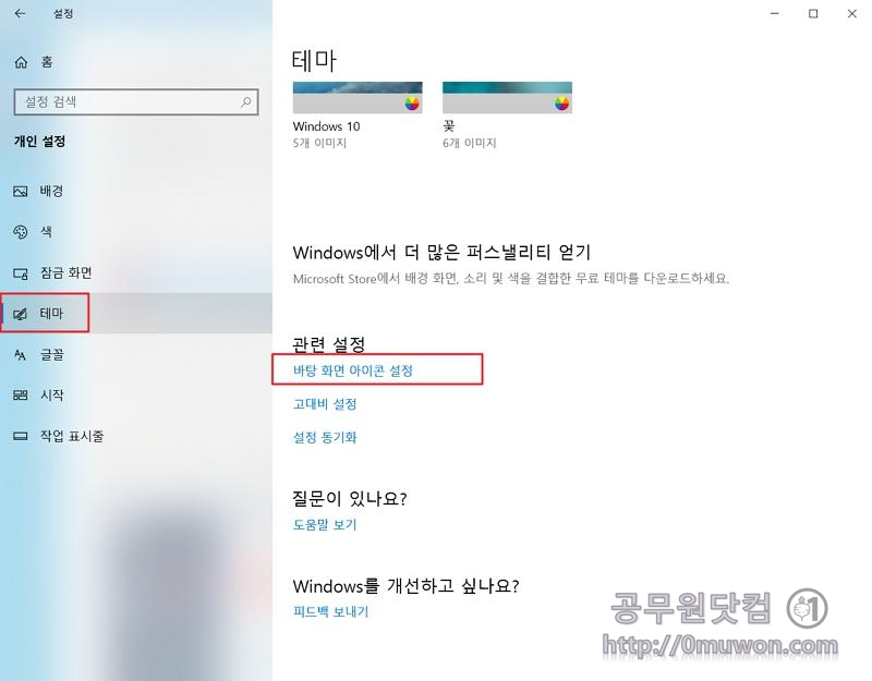 ▼ 왼쪽에 '테마' 메뉴를 클릭합니다. 관련설정 '바탕화면 아이콘 설정'을 클릭합니다.