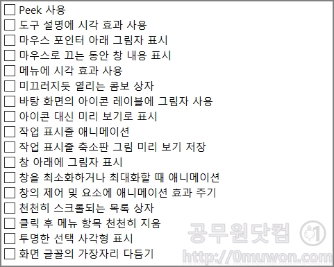 "사용자 지정"을 클릭 후 체크박스에서 필요한 부분만 체크를 하고 나머지는 해제를 합니다. 체크된 것이 적을수록 속도는 빨라집니다. 바탕화면의 아이콘 레이블에 그림자 사용, 아이콘 대신 미리보기로 표시, 화면글꼴의 가장자리 다듬기 정보만 체크를 하였습니다. 모두 체크 해제 해도 상관은 없습니다. 본인에게 꼭 필요한 시각효과가 아니라면 해제하면 됩니다.