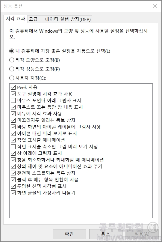 시각효과 탭에서 윈도우의 모양 및 성능에 사용할 설정을 선택하면 됩니다. 내 컴퓨터에서 가장 좋은 설정을 자동으로 선택, 최적모양으로 조정, 최적성능으로 조정, 사용자 지정을 통해 설정을 변경할 수 있습니다. 현재 기본옵션은 자동선택입니다.