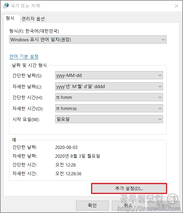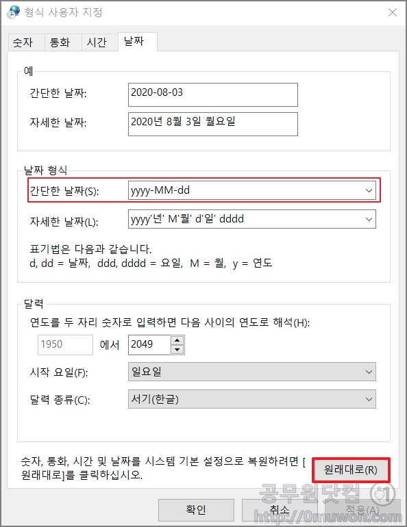 가장 많이 사용하는 방법입니다만 권장하지 않습니다. 권장하지 않는데 설정하는 방법을 설명하는 이유는 원래대로 되돌리기 위해서 입니다. 만약 설정에서 바꾼분들은 잘 보시고 다시 요일이 없는 기본설정으로 되돌리시기 바랍니다. 되돌린 후 아래에서 추천하는 방법으로 요일을 표시하세요. 요일 추가 후 프로그램에 문제가 생겼다면 다시 원래대로 설정을 하셔야 합니다.