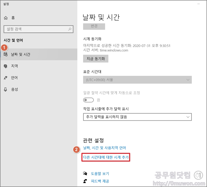 ▼ "날짜 및 시간" 설정에서 관련설정 중 "다른 시간대에 대한 시간 추가" 메뉴를 클릭합니다.