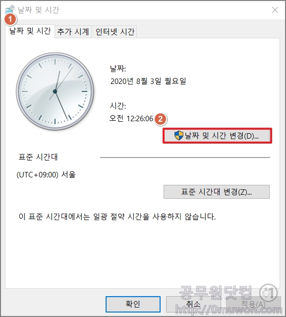 ▼ 날짜 및 시간 탭을 누른 후 "날짜 및 시간 변경(D)" 버튼을 선택합니다.