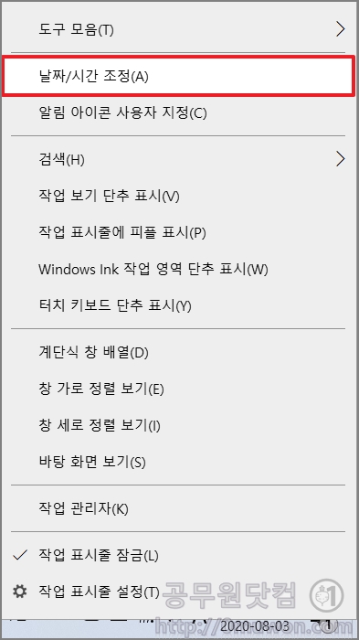 ▼ 시계에 마우스를 놓고 마우스 오른쪽 버튼을 클릭합니다. "날짜/시간 조정(A)"를 클릭합니다.