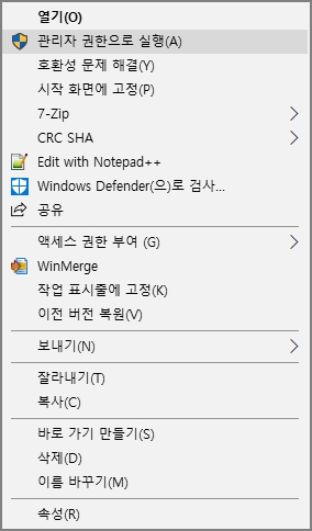 ▼ 마우스 오른쪽 클릭 후 "관리자 권한으로 실행" 으로 파일을 실행합니다. 그냥 해보니 실행되지 않았었습니다.