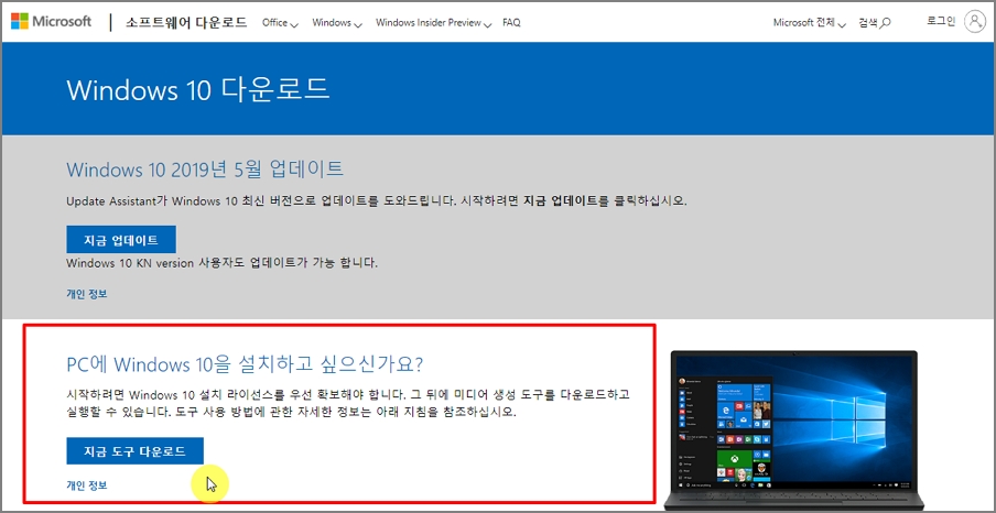 ▼ 오류시에는 "지금 업데이트" 보다는 "지금 도구 다운로드" 버튼을 클릭하여 윈도우 10을 다운받아 설치를 합니다. 다운로드 버튼을 클릭합니다.