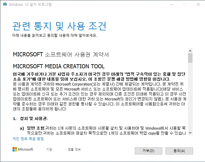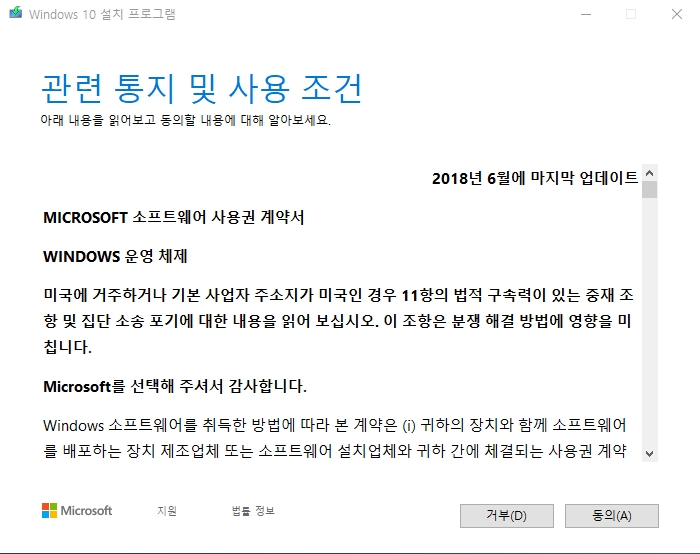 ▼ 윈도우 10 업데이트를 위한 관련 통지 및 사용 조건이 또 나옵니다. 동의 버튼을 클릭합니다.