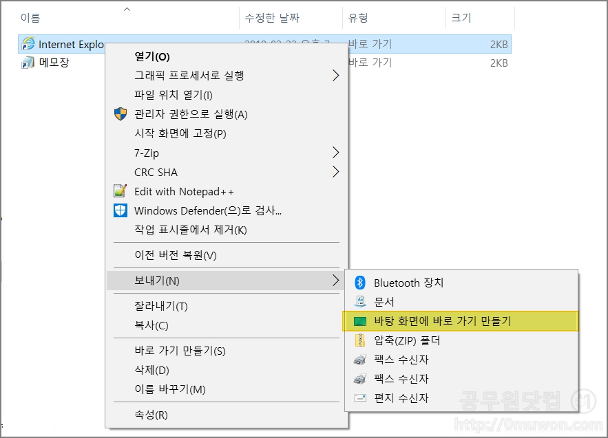 ▼ 익스플로러 오른쪽 마우스 클릭 후 "보내기 > 바탕화면에 바로가기 만들기" 를 클릭합니다.