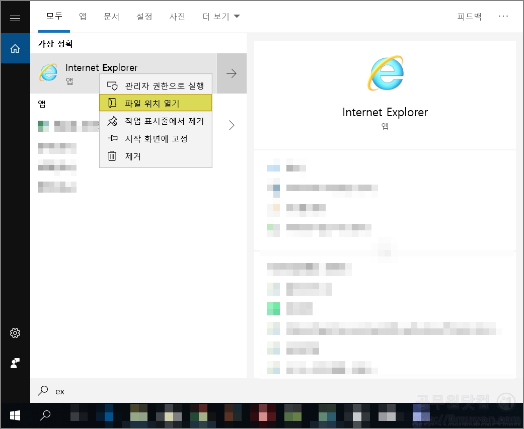 ▼ 바탕화면에 익스플로러 바로가기를 설치하면 더 쉽게 익스플로러를 이용할 수 있습니다. 검색 창에서 Internet Explorer 또는 ex 를 검색합니다. 앱을 선택 후 마우스 오른쪽 버튼을 클릭 후 파일 위치 열기를 클릭합니다.