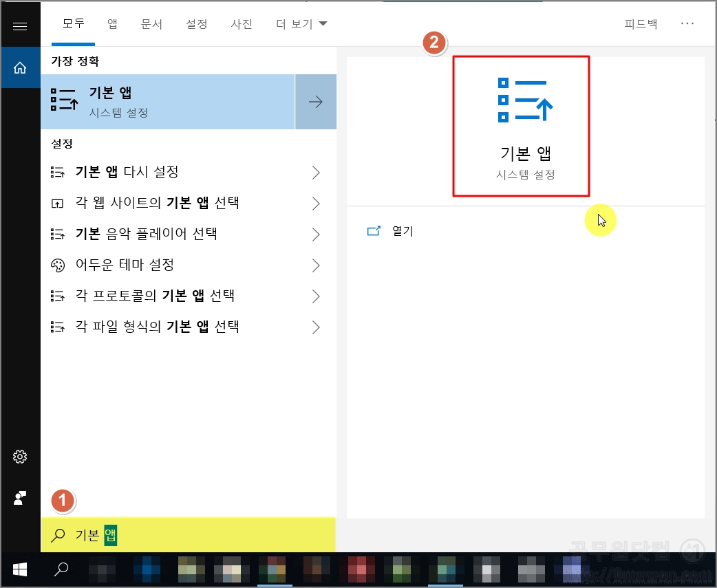▼ 윈도우 검색버튼을 클릭 후 ① "기본 앱"을 입력합니다. ② "기본 앱"을 클릭합니다.