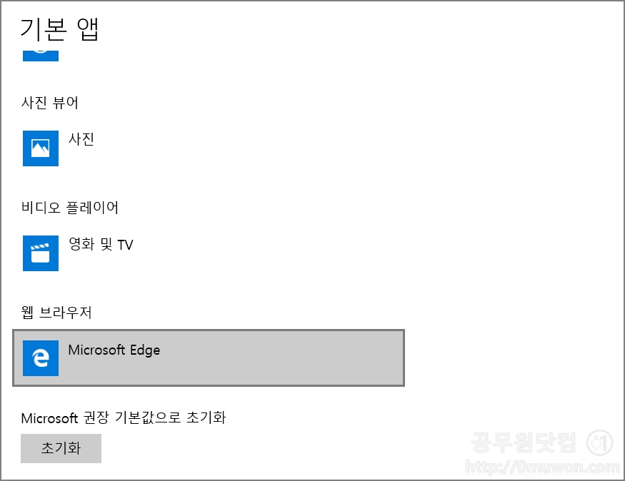 ▼ 기본 앱 설정은 현재 컴퓨터의 기본설정에 대한 값들을 변경할 수 있습니다. 기본 앱 중간에 보면 웹브라우저 설정을 할수 있습니다. 기본인 Microsoft Edge로 되어 있습니다.