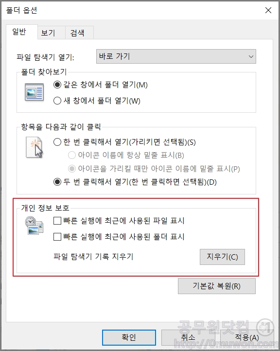 ▼ "폴더 옵션 > 일반 > 개인 정보 보호" 에서 빠른 실행에 최근에 사용된 파일 표시 및 빠른 실행에 최근에 사용된 폴더 표시 2개 모두를 선택 해제한 후 적용 버튼을 클릭합니다.